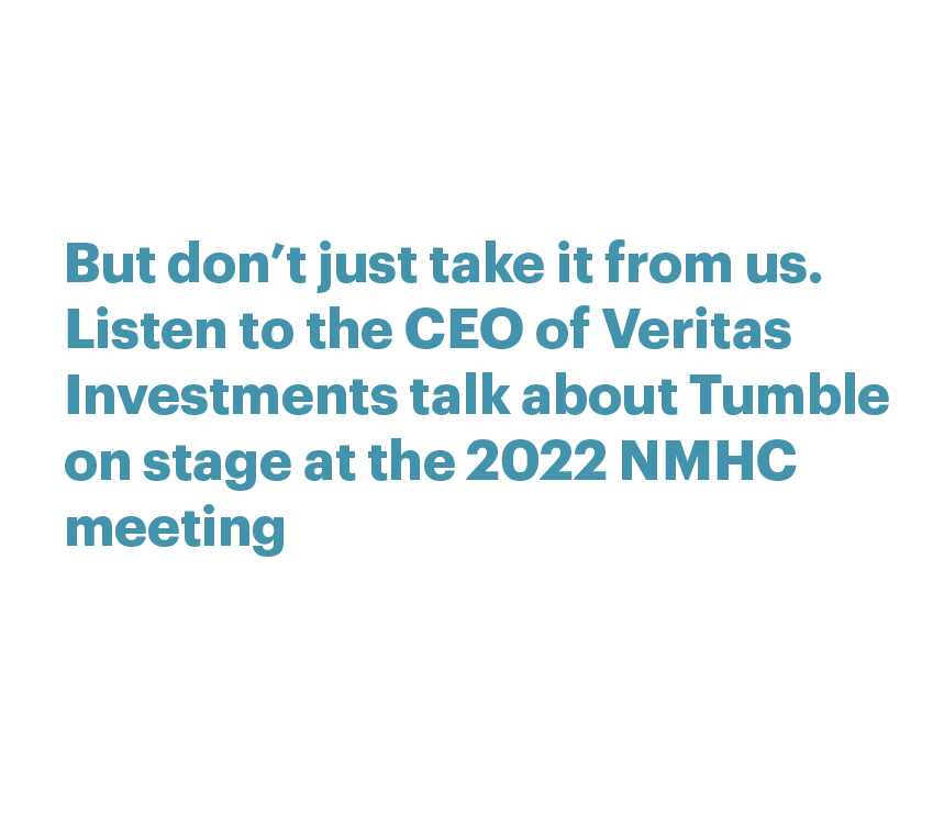 All machines utilize Tumble’s proprietary connected system with cashless payment. With signing of a 5 year or more term, Tumble will include one (1) optional Smart Center and our upcoming resident insights platform in this package. Additional Smart Centers may be purchased for $600 each.